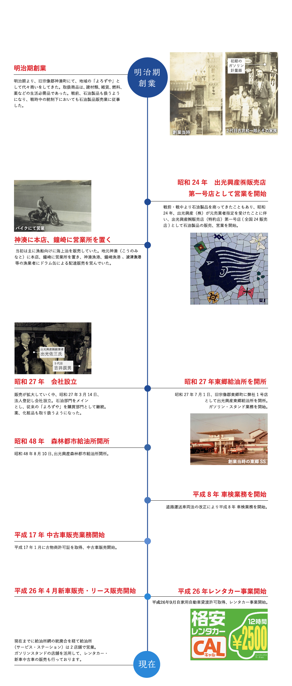 第一号店として営業を開始 - 戦前・戦中より石油製品を商ってきたこともあり、昭和24 年、出光興産(株)が元売業者指定を受けたことに伴い、出光興産㈱販売店(特約店)第一号店( 全国24 販売店) として石油製品の販売、営業を開始。