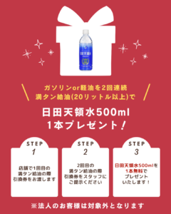 ガソリン・軽油を2回続けて満タン給油(20リットル以上)された方に日田天領水プレゼント中♪